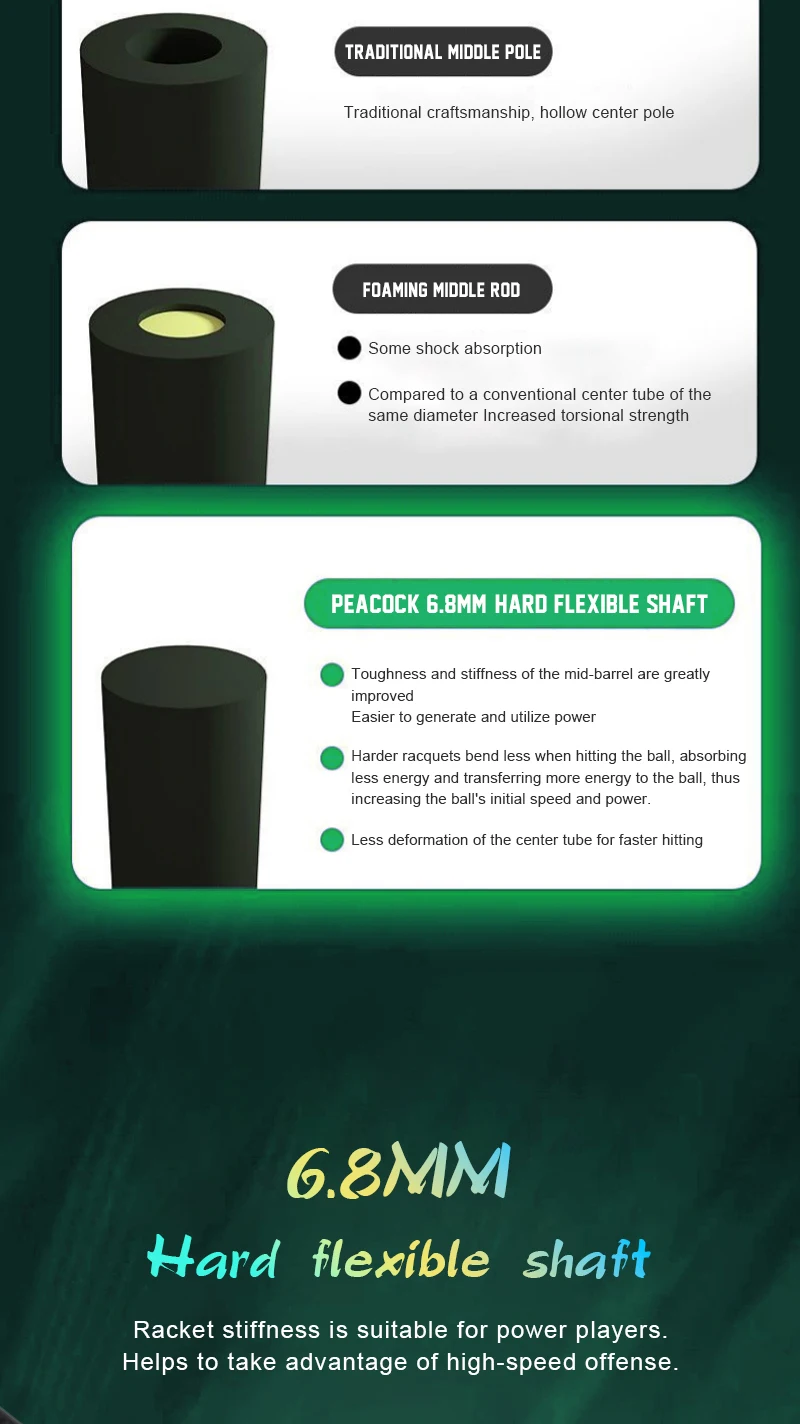 Of course, the stiffer the center stick is not the better, as an overly stiff center stick can affect overall flexibility and give a "hard" feel to the swing. A relatively soft center stick is suitable for beginners. A relatively hard center stick is suitable for amateurs with a certain level of skill (who know how to hit the ball with wrist power and can master the eight basic hitting motions of pulling, killing, chopping, pumping, pushing and releasing. (Rolling, hooking).