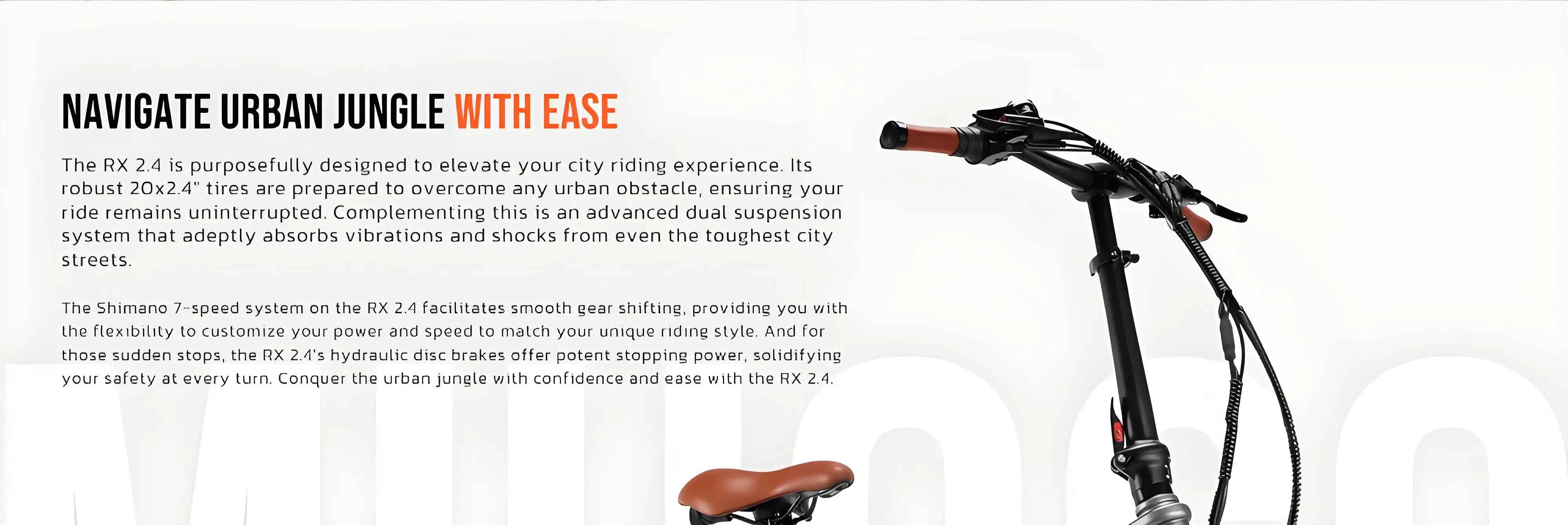 SPECIFICATIONSBrand Name: NoEnName_NullCertification: ceFolded: YesFrame Material: Aluminum AlloyHign-concerned Chemical: NoneMax Speed: <25km/hModel Number: MIHOGO RX 2.4Motor: BrushlessOrigin: Mainland ChinaPower Source: Lithium BatteryPower Supply: Lithium BatteryRange per Power: 31 - 60 kmRated Passenger Capacity: Two SeatStyle: Luxury TypeVoltage: 48VWattage: 200 - 250wWheel Size: 20“
