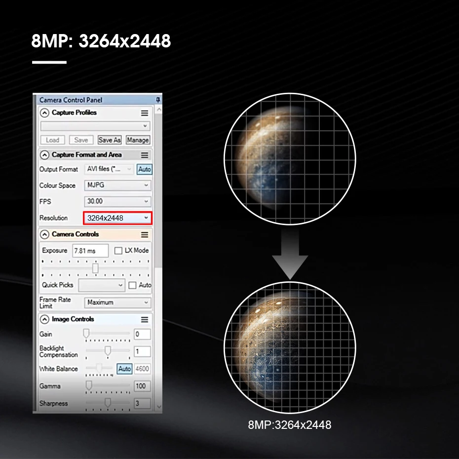 When enter the sharpcap software, all camera settings are automatically. You may see the picture is out of color balance or maybe a little blurry. You need to choose a resolution (8MP 3264×2448 is most clear), then choose the YUV video format. This is the best image resolution.