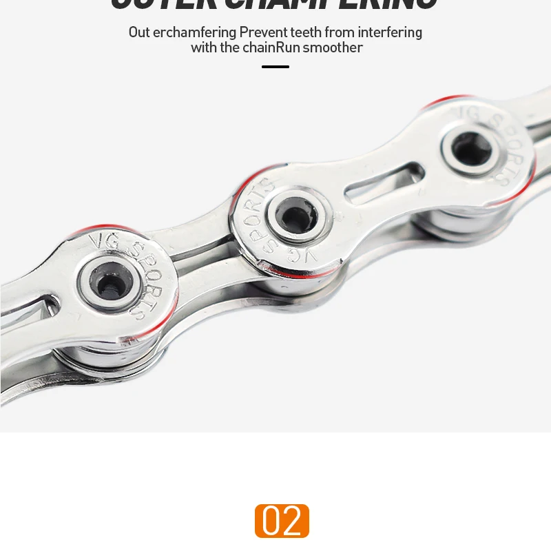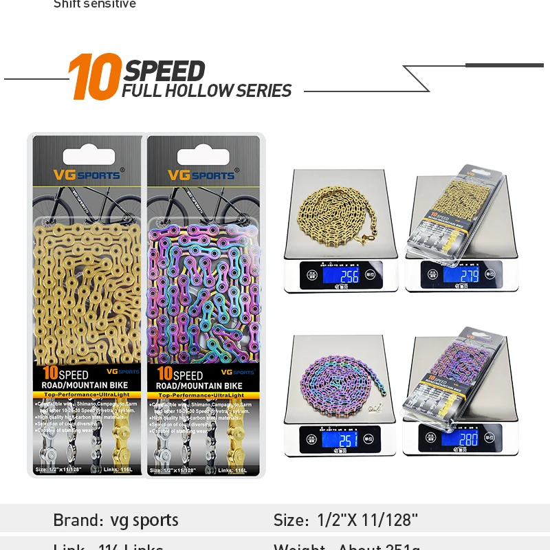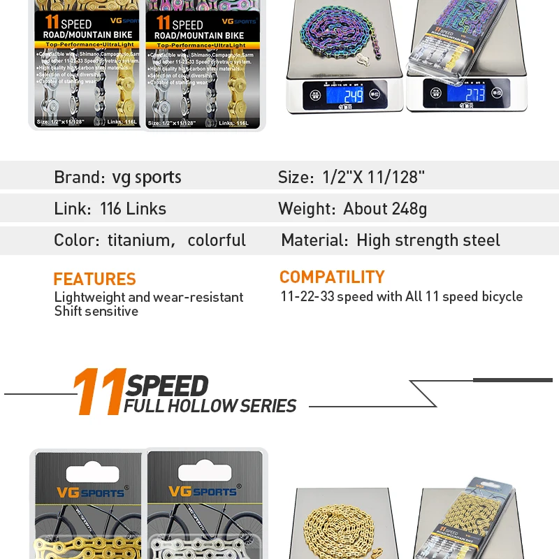 SPECIFICATIONSBrand Name: VG SportsColor: Gold / Silver / Gold Titanium / Gold Silver / RainbowHign-concerned Chemical: NoneModel Number: vg bicycle chainOrigin: Mainland ChinaQuantity: 1pcSpeed: 6/7/8-Speed / 9-Speed / 10-Speed / 11-Speed If you only need 1pc chain,click hereor here